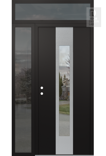 Modern Steel Front Door DIAMOND A1 52" X 96" BLACK/BLACK CLEAR GLASS PANEL STAINLESS STEEL LHI WITH SIDELITE AND TRANSOM MIRRORED GLASS