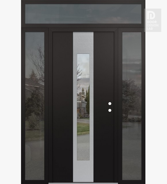 Modern Steel Front Door DIAMOND A1 60" X 96" BLACK/BLACK CLEAR GLASS PANEL STAINLESS STEEL RHI WITH 2 SIDELITES AND TRANSOM MIRRORED GLASS