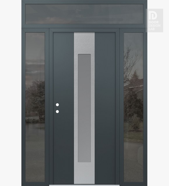 Modern Steel Front Door DIAMOND A1 64" X 96" ANTHRACITE/ANTHRACITE FROSTED GLASS PANEL STAINLESS STEEL LHI WITH 2 SIDELITES AND TRANSOM MIRRORED GLASS