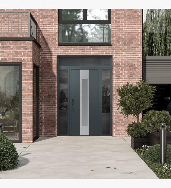 Modern Steel Front Door DIAMOND A1 64" X 96" ANTHRACITE/ANTHRACITE FROSTED GLASS PANEL STAINLESS STEEL RHI WITH 2 SIDELITES AND TRANSOM MIRRORED GLASS