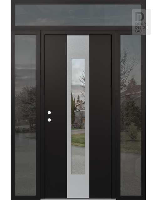 Modern Steel Front Door DIAMOND A1 64" X 96" BLACK/BLACK CLEAR GLASS PANEL STAINLESS STEEL LHI WITH 2 SIDELITES AND TRANSOM MIRRORED GLASS