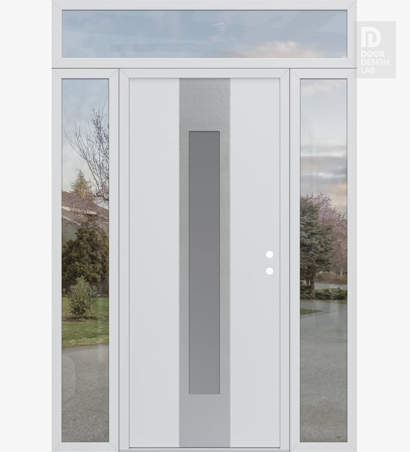 Modern Steel Front Door DIAMOND A1 64" X 96" BLACK/WHITE FROSTED GLASS PANEL STAINLESS STEEL RHI WITH 2 SIDELITES AND TRANSOM CLEAR GLASS
