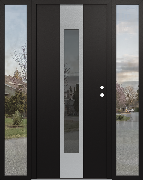 Modern Steel Front Door DIAMOND A1 68" X 80" BLACK/BLACK MIRRORED GLASS PANEL STAINLESS STEEL RHI WITH 2 SIDELITES CLEAR GLASS