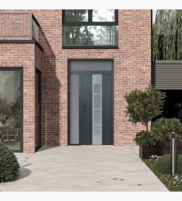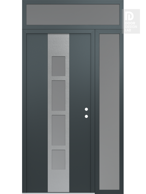 Modern Steel Front Door DIAMOND A10 48" X 96" ANTHRACITE/ANTHRACITE FROSTED GLASS PANEL STAINLESS STEEL RHI WITH SIDELITE AND TRANSOM FROSTED GLASS