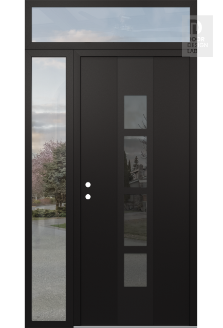 Modern Steel Front Door DIAMOND A10 48" X 96" BLACK/BLACK MIRRORED GLASS PANEL BLACK LHI WITH SIDELITE AND TRANSOM CLEAR GLASS