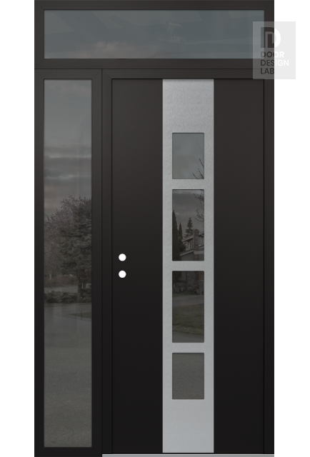 Modern Steel Front Door DIAMOND A10 48" X 96" BLACK/BLACK MIRRORED GLASS PANEL STAINLESS STEEL LHI WITH SIDELITE AND TRANSOM MIRRORED GLASS