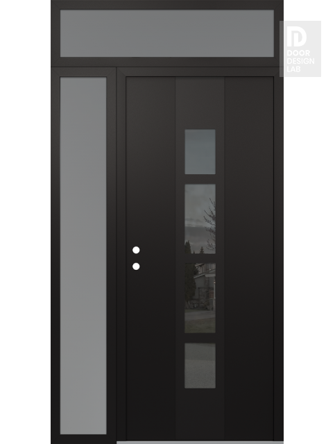 Modern Steel Front Door DIAMOND A10 52" X 96" BLACK/BLACK MIRRORED GLASS PANEL BLACK LHI WITH SIDELITE AND TRANSOM FROSTED GLASS