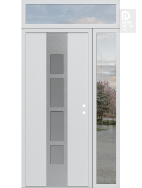 Modern Steel Front Door DIAMOND A10 52" X 96" BLACK/WHITE FROSTED GLASS PANEL STAINLESS STEEL RHI WITH SIDELITE AND TRANSOM CLEAR GLASS