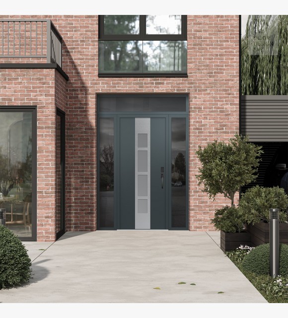 Modern Steel Front Door DIAMOND A10 60" X 96" ANTHRACITE/ANTHRACITE FROSTED GLASS PANEL STAINLESS STEEL LHI WITH 2 SIDELITES AND TRANSOM MIRRORED GLASS
