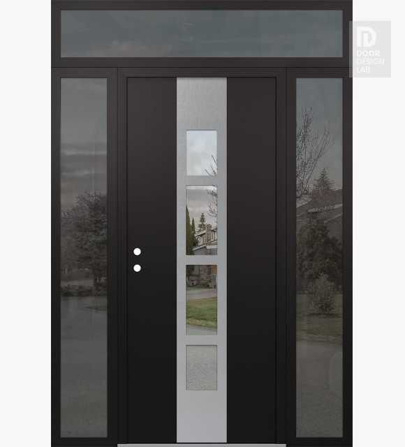 Modern Steel Front Door DIAMOND A10 60" X 96" BLACK/BLACK CLEAR GLASS PANEL STAINLESS STEEL LHI WITH 2 SIDELITES AND TRANSOM MIRRORED GLASS