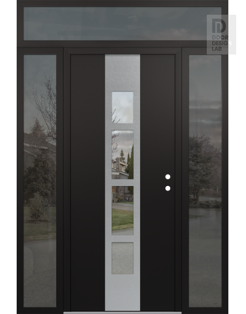 Modern Steel Front Door DIAMOND A10 60" X 96" BLACK/BLACK CLEAR GLASS PANEL STAINLESS STEEL RHI WITH 2 SIDELITES AND TRANSOM MIRRORED GLASS