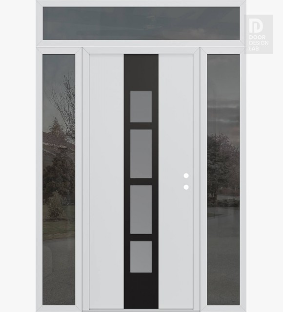 Modern Steel Front Door DIAMOND A10 60" X 96" BLACK/WHITE FROSTED GLASS PANEL BLACK RHI WITH 2 SIDELITES AND TRANSOM MIRRORED GLASS