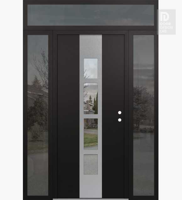 Modern Steel Front Door DIAMOND A10 64" X 96" BLACK/BLACK CLEAR GLASS PANEL STAINLESS STEEL RHI WITH 2 SIDELITES AND TRANSOM MIRRORED GLASS