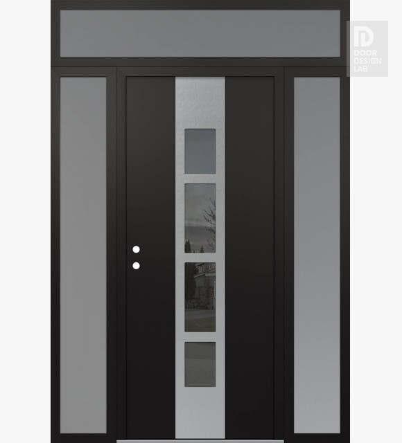 Modern Steel Front Door DIAMOND A10 64" X 96" BLACK/BLACK MIRRORED GLASS PANEL STAINLESS STEEL LHI WITH 2 SIDELITES AND TRANSOM FROSTED GLASS