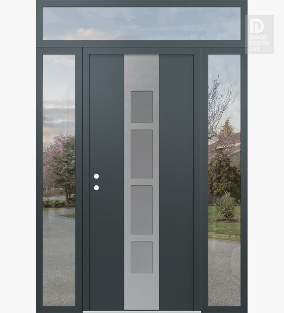 Modern Steel Front Door DIAMOND A10 68" X 96" ANTHRACITE/ANTHRACITE FROSTED GLASS PANEL STAINLESS STEEL LHI WITH 2 SIDELITES AND TRANSOM CLEAR GLASS