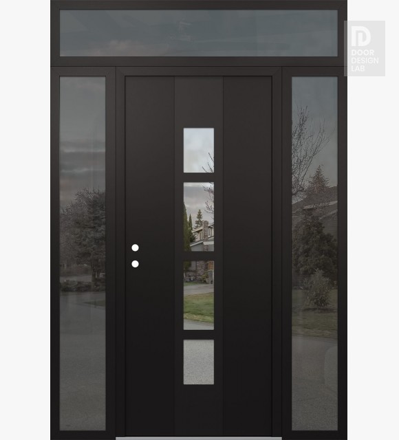 Modern Steel Front Door DIAMOND A10 68" X 96" BLACK/BLACK CLEAR GLASS PANEL BLACK LHI WITH 2 SIDELITES AND TRANSOM MIRRORED GLASS