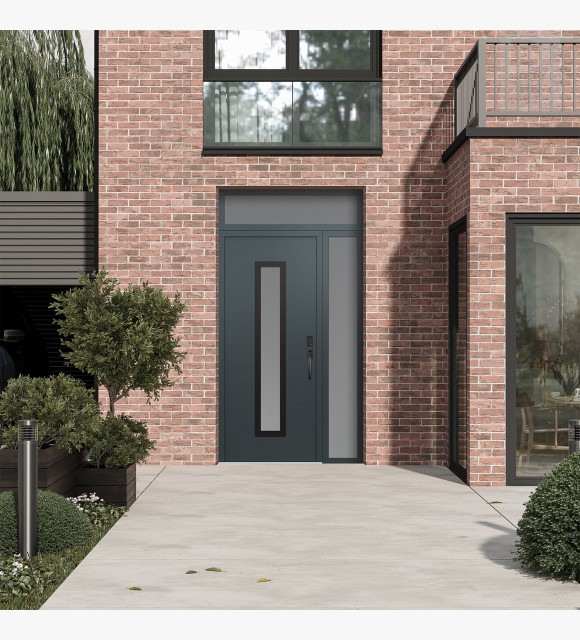 Modern Steel Front Door DIAMOND A11 48" X 96" ANTHRACITE/ANTHRACITE FROSTED GLASS PANEL BLACK LHI WITH SIDELITE AND TRANSOM FROSTED GLASS