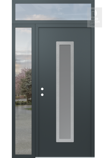 Modern Steel Front Door DIAMOND A11 48" X 96" ANTHRACITE/ANTHRACITE FROSTED GLASS PANEL STAINLESS STEEL LHI WITH SIDELITE AND TRANSOM CLEAR GLASS