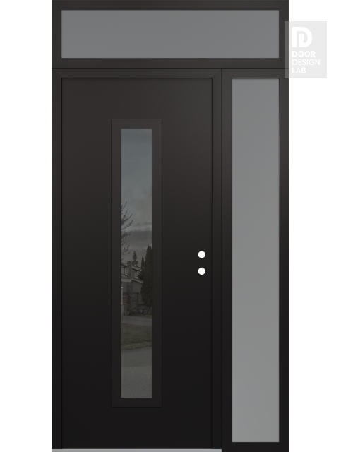 Modern Steel Front Door DIAMOND A11 48" X 96" BLACK/BLACK MIRRORED GLASS PANEL BLACK RHI WITH SIDELITE AND TRANSOM FROSTED GLASS
