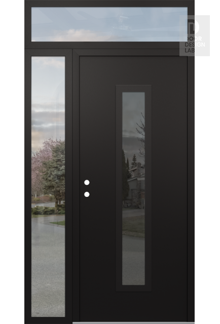 Modern Steel Front Door DIAMOND A11 52" X 96" BLACK/BLACK MIRRORED GLASS PANEL BLACK LHI WITH SIDELITE AND TRANSOM CLEAR GLASS