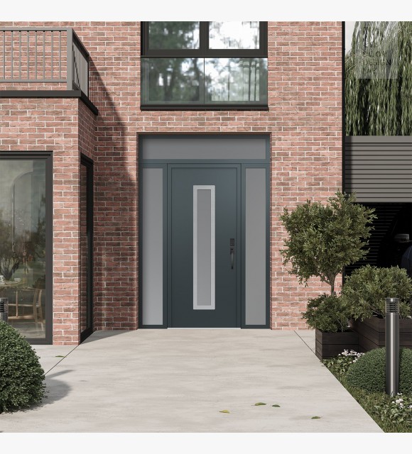 Modern Steel Front Door DIAMOND A11 64" X 96" ANTHRACITE/ANTHRACITE FROSTED GLASS PANEL STAINLESS STEEL LHI WITH 2 SIDELITES AND TRANSOM FROSTED GLASS