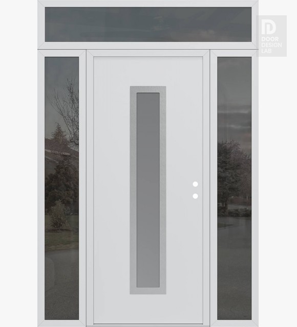 Modern Steel Front Door DIAMOND A11 64" X 96" BLACK/WHITE FROSTED GLASS PANEL STAINLESS STEEL RHI WITH 2 SIDELITES AND TRANSOM MIRRORED GLASS