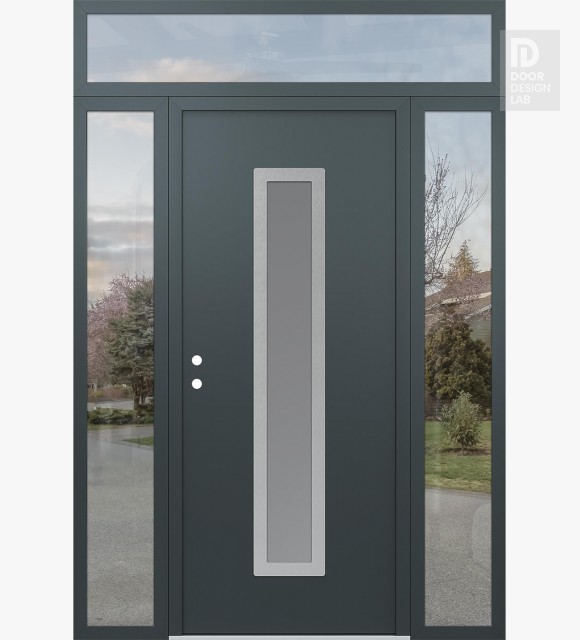 Modern Steel Front Door DIAMOND A11 68" X 96" ANTHRACITE/ANTHRACITE FROSTED GLASS PANEL STAINLESS STEEL LHI WITH 2 SIDELITES AND TRANSOM CLEAR GLASS