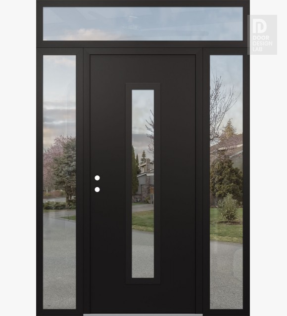 Modern Steel Front Door DIAMOND A11 68" X 96" BLACK/BLACK CLEAR GLASS PANEL BLACK LHI WITH 2 SIDELITES AND TRANSOM CLEAR GLASS