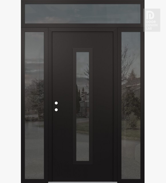 Modern Steel Front Door DIAMOND A11 68" X 96" BLACK/BLACK MIRRORED GLASS PANEL BLACK LHI WITH 2 SIDELITES AND TRANSOM MIRRORED GLASS