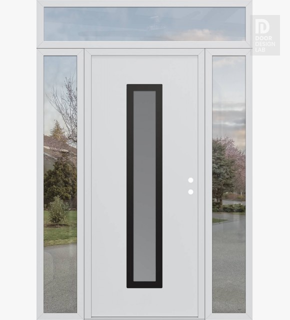 Modern Steel Front Door DIAMOND A11 68" X 96" BLACK/WHITE FROSTED GLASS PANEL BLACK RHI WITH 2 SIDELITES AND TRANSOM CLEAR GLASS