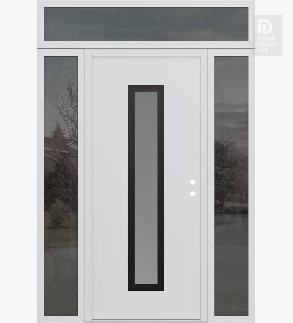 Modern Steel Front Door DIAMOND A11 68" X 96" BLACK/WHITE FROSTED GLASS PANEL BLACK RHI WITH 2 SIDELITES AND TRANSOM MIRRORED GLASS