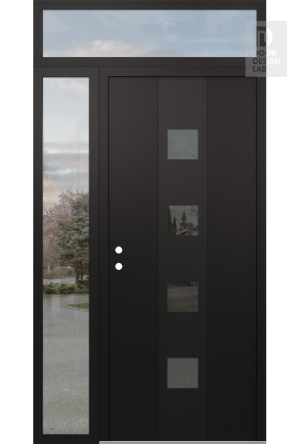 Modern Steel Front Door DIAMOND A12 48" X 96" BLACK/BLACK MIRRORED GLASS PANEL BLACK LHI WITH SIDELITE AND TRANSOM CLEAR GLASS