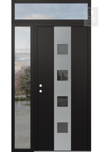 Modern Steel Front Door DIAMOND A12 48" X 96" BLACK/BLACK MIRRORED GLASS PANEL STAINLESS STEEL LHI WITH SIDELITE AND TRANSOM CLEAR GLASS