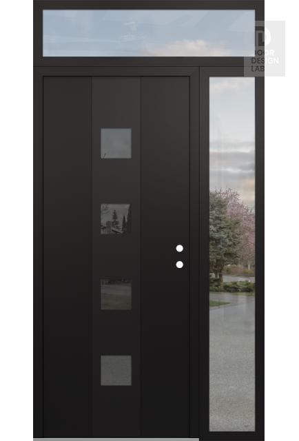 Modern Steel Front Door DIAMOND A12 50" X 96" BLACK/BLACK MIRRORED GLASS PANEL BLACK RHI WITH SIDELITE AND TRANSOM CLEAR GLASS