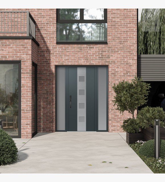 Modern Steel Front Door DIAMOND A12 60" X 80" ANTHRACITE/ANTHRACITE FROSTED GLASS PANEL STAINLESS STEEL RHI WITH 2 SIDELITES FROSTED GLASS