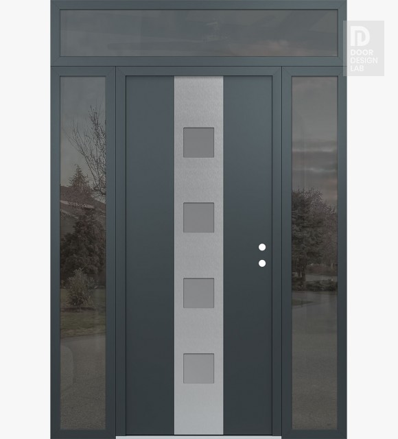 Modern Steel Front Door DIAMOND A12 60" X 96" ANTHRACITE/ANTHRACITE FROSTED GLASS PANEL STAINLESS STEEL RHI WITH 2 SIDELITES AND TRANSOM MIRRORED GLASS