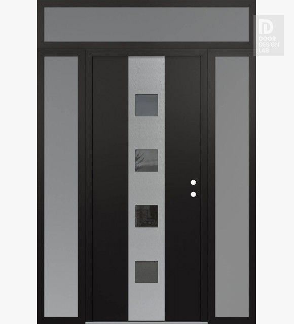 Modern Steel Front Door DIAMOND A12 60" X 96" BLACK/BLACK MIRRORED GLASS PANEL STAINLESS STEEL RHI WITH 2 SIDELITES AND TRANSOM FROSTED GLASS