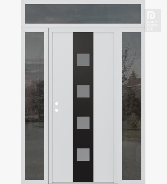 Modern Steel Front Door DIAMOND A12 60" X 96" BLACK/WHITE FROSTED GLASS PANEL BLACK LHI WITH 2 SIDELITES AND TRANSOM MIRRORED GLASS