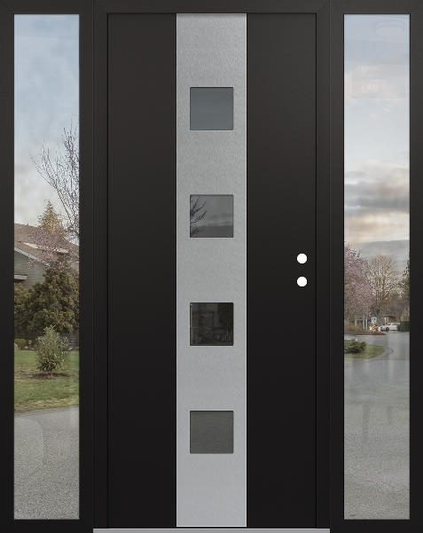 Modern Steel Front Door DIAMOND A12 64" X 80" BLACK/BLACK MIRRORED GLASS PANEL STAINLESS STEEL RHI WITH 2 SIDELITES CLEAR GLASS
