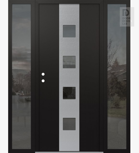 Modern Steel Front Door DIAMOND A12 68" X 80" BLACK/BLACK MIRRORED GLASS PANEL STAINLESS STEEL LHI WITH 2 SIDELITES MIRRORED GLASS