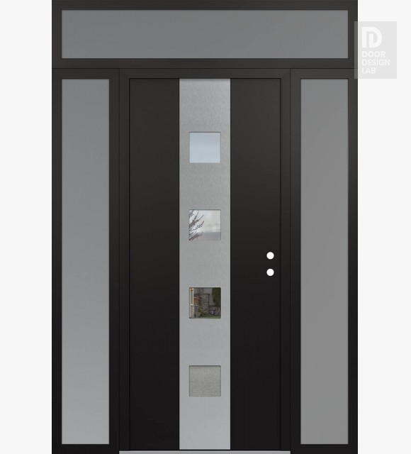 Modern Steel Front Door DIAMOND A12 68" X 96" BLACK/BLACK CLEAR GLASS PANEL STAINLESS STEEL RHI WITH 2 SIDELITES AND TRANSOM FROSTED GLASS