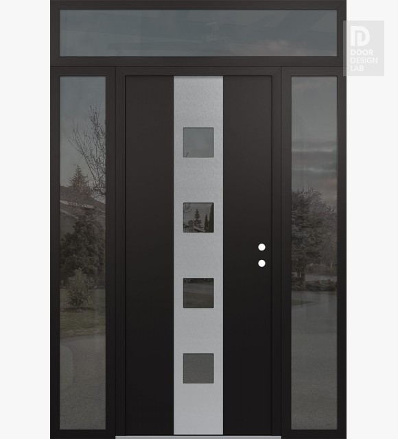 Modern Steel Front Door DIAMOND A12 68" X 96" BLACK/BLACK MIRRORED GLASS PANEL STAINLESS STEEL RHI WITH 2 SIDELITES AND TRANSOM MIRRORED GLASS