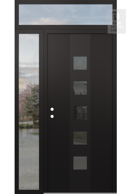 Modern Steel Front Door DIAMOND A13 48" X 96" BLACK/BLACK MIRRORED GLASS PANEL BLACK LHI WITH SIDELITE AND TRANSOM CLEAR GLASS