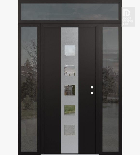 Modern Steel Front Door DIAMOND A13 60" X 96" BLACK/BLACK CLEAR GLASS PANEL STAINLESS STEEL RHI WITH 2 SIDELITES AND TRANSOM MIRRORED GLASS