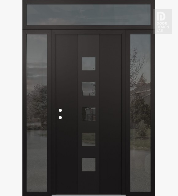 Modern Steel Front Door DIAMOND A13 60" X 96" BLACK/BLACK MIRRORED GLASS PANEL BLACK LHI WITH 2 SIDELITES AND TRANSOM MIRRORED GLASS
