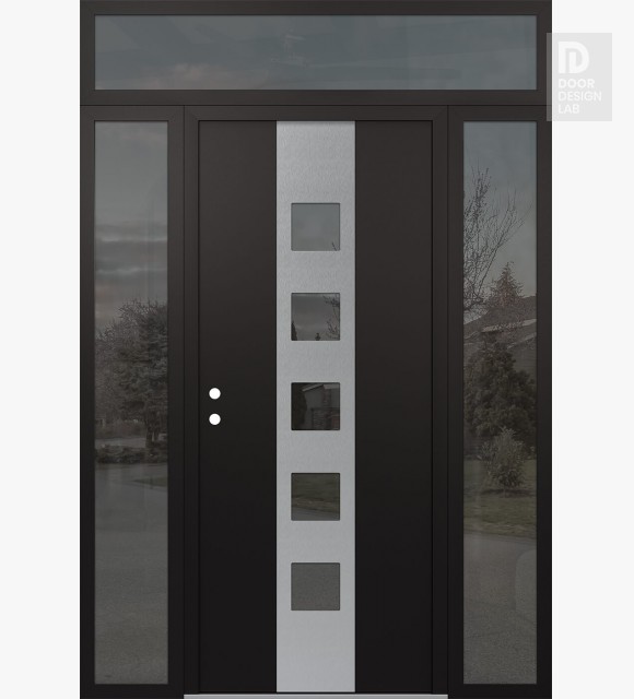 Modern Steel Front Door DIAMOND A13 60" X 96" BLACK/BLACK MIRRORED GLASS PANEL STAINLESS STEEL LHI WITH 2 SIDELITES AND TRANSOM MIRRORED GLASS
