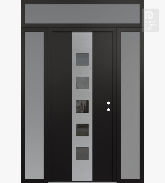 Modern Steel Front Door DIAMOND A13 60" X 96" BLACK/BLACK MIRRORED GLASS PANEL STAINLESS STEEL RHI WITH 2 SIDELITES AND TRANSOM FROSTED GLASS