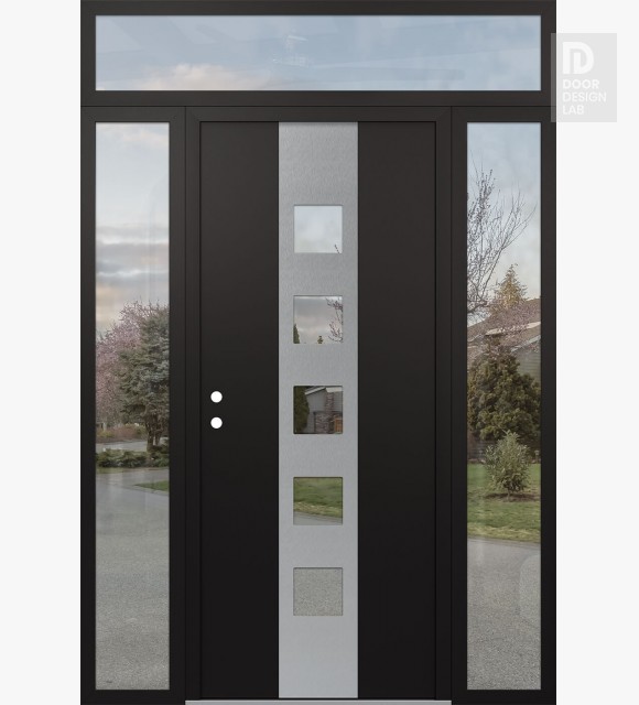 Modern Steel Front Door DIAMOND A13 64" X 96" BLACK/BLACK CLEAR GLASS PANEL STAINLESS STEEL LHI WITH 2 SIDELITES AND TRANSOM CLEAR GLASS