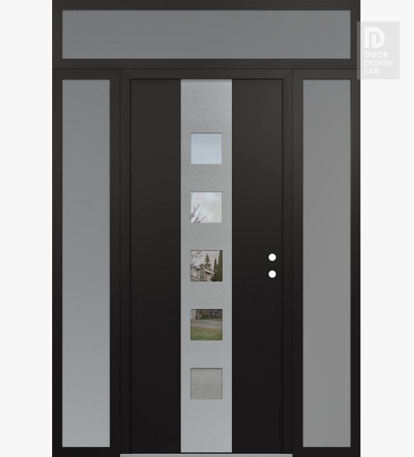 Modern Steel Front Door DIAMOND A13 64" X 96" BLACK/BLACK CLEAR GLASS PANEL STAINLESS STEEL RHI WITH 2 SIDELITES AND TRANSOM FROSTED GLASS