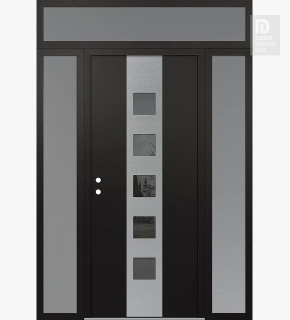 Modern Steel Front Door DIAMOND A13 64" X 96" BLACK/BLACK MIRRORED GLASS PANEL STAINLESS STEEL LHI WITH 2 SIDELITES AND TRANSOM FROSTED GLASS